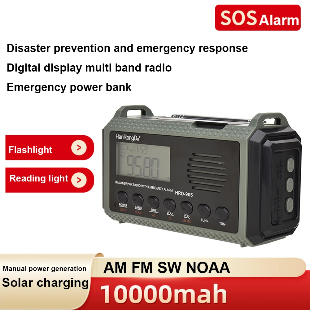 This is a portable disaster prevention and emergency full-band radio. This product uses software programming to realize digital display of full-band wireless broadcast reception: FM, medium wave, short wave, WX (North American national weather band). Built-in 10000mah ultra-large capacity battery, supports solar charging, hand generator charging, and external DC5V power supply charging. And supports emergency power supply with 3×1.5V AAA battery. The product is designed with reading light lighting, flashlight lighting, SOS alarm, and emergency measures for power bank use. It is an emergency product that can be prepared at home and can be carried when playing outdoors.
